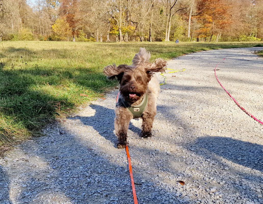 Sie ist mit allen um die Wette getobt und hat kein Ende gefunden. Das war so schön zu sehen, wie viel Spaß sie in dieser kleinen, ihr bis dato noch fremden Hundegruppe hatte. Sie fühlte sich offensichtlich wohl und das hat uns sehr gefreut. Herrchen und Frauchen haben wir dann später in einem Cafe um die Ecke getroffen und die Umgebung dort fand sie eher mittelprächtig, denn die Geräusche der Stadt sind ihr nicht so vertraut.