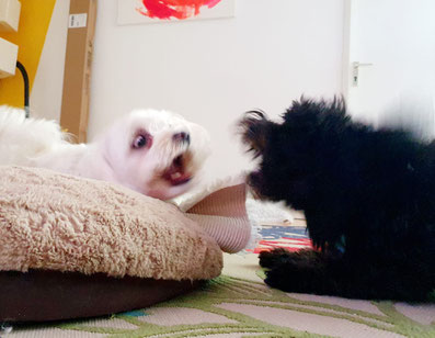 Bei unkontroliertem Spielverhalten, zum Beispiel zwischen einem 16 Wochen alten Welpen und einem 6 Monate alten Junghund, selbst wenn der eine ähnliche Körpergröße hat, kann für den jüngeren Hund