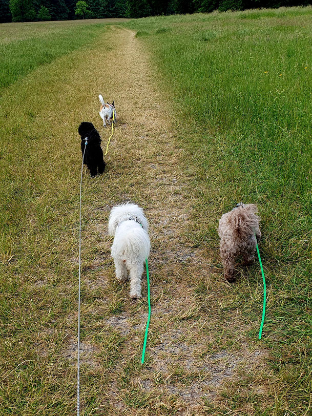 Die drei Hunde mit kurzer Schleppleine unten auf dem Foto sind alle schon seit Jahren bei uns in der Betreuung und es spricht absolut nichts gegen die ganz kurze Variante der Schleppleine.