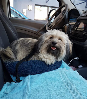 In einer Transportbox reisen nur diejenigen Hunde, die eine Box bereits kennen. Andere Gasthunde dürfen bei uns angegurtet Platz nehmen -  so wie hier das kleine Fräulein auf dem Beifahrersitz. Das Fahrzeug auf diesem Foto wurde inzwischen durch ein Elektrofahrzeug ersetzt.